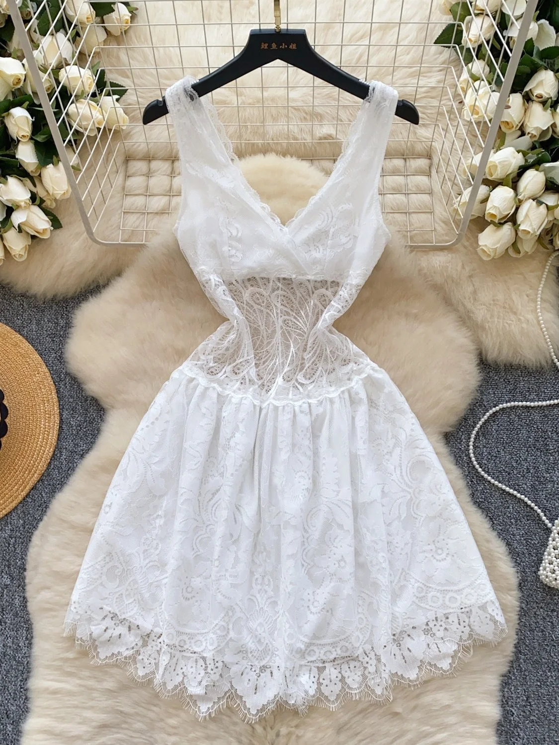 White Lace V Neck Sheer Summer Mini Dress